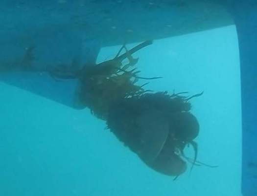 Yesterday we had to dive on the prop to clear kelp that was causing problems making way. Note how it’s folded closed…it couldn’t open.