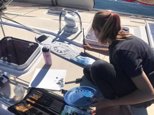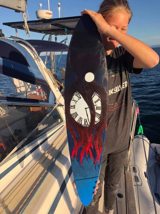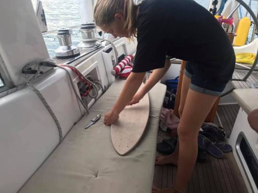 Kirsten loves her skateboard. Back in San Diego she started sanding it. Along the way to La Cruz she has painted, epoxied and drilled new holes, cleared coated, added new grip tape, changed the bearings, and put it back together. Super proud of her!