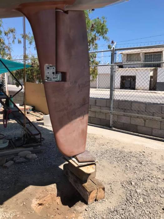 Testing alignment with a new mid-bearing at the top of the rudder. Local machine shop customized a chunk of Delrin for us. It fits pretty well. Next up is to replace the rudder heel bearing/shoe (lower in this picture).