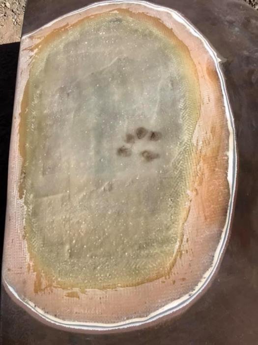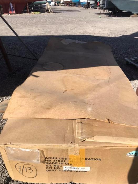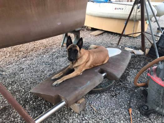 Also, Bonita the yard dog thinks the dinghy is a wonderful bed. We have been trying to discourage this because of wet fiberglass and epoxy. Last night she stepped in our mostly cured epoxy and left us a gift. 🤦♀️ Then this morning she tried to make the box holding our new dinghy her bed and got stuck in the box. 😮😂 Graham had to lift her out of it. Now there is a cover on the box.